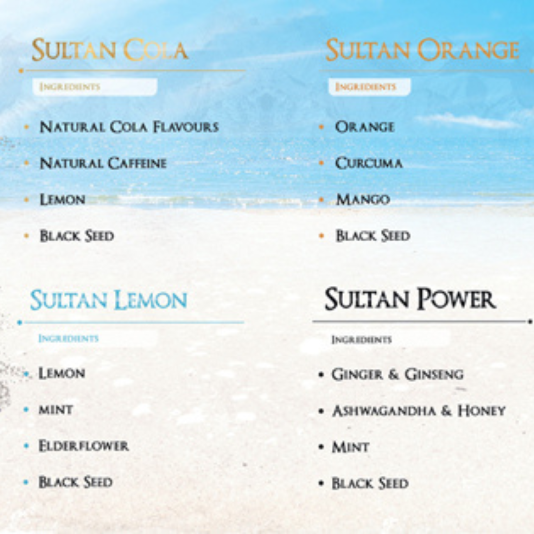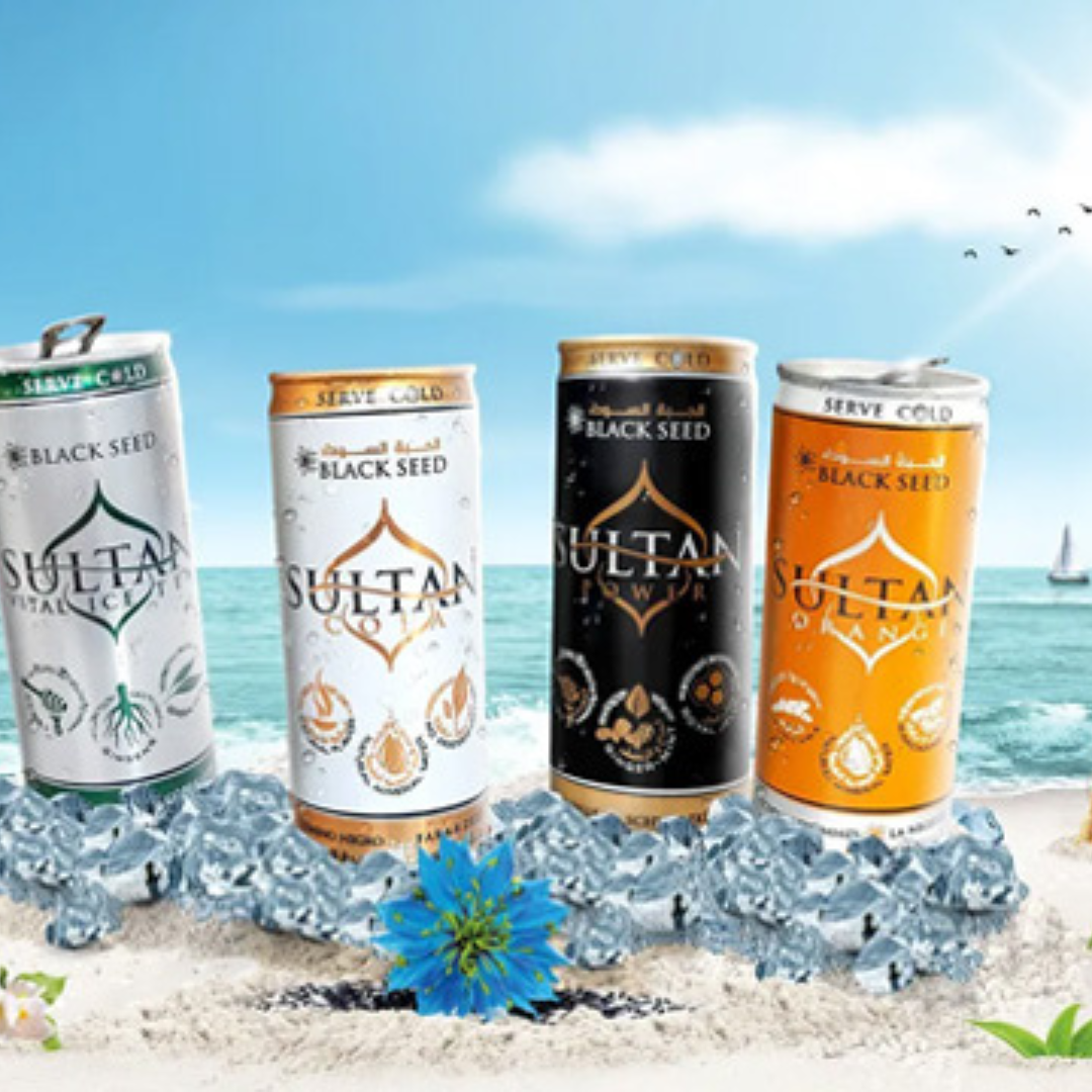 Sultan™ combines black seed (Nigella sativa) with modern natural ingredients like ginger, ginseng, ashwagandha, mint, honey, green tea and fruit extracts — creating a premium, functional drink designed for today’s lifestyle.