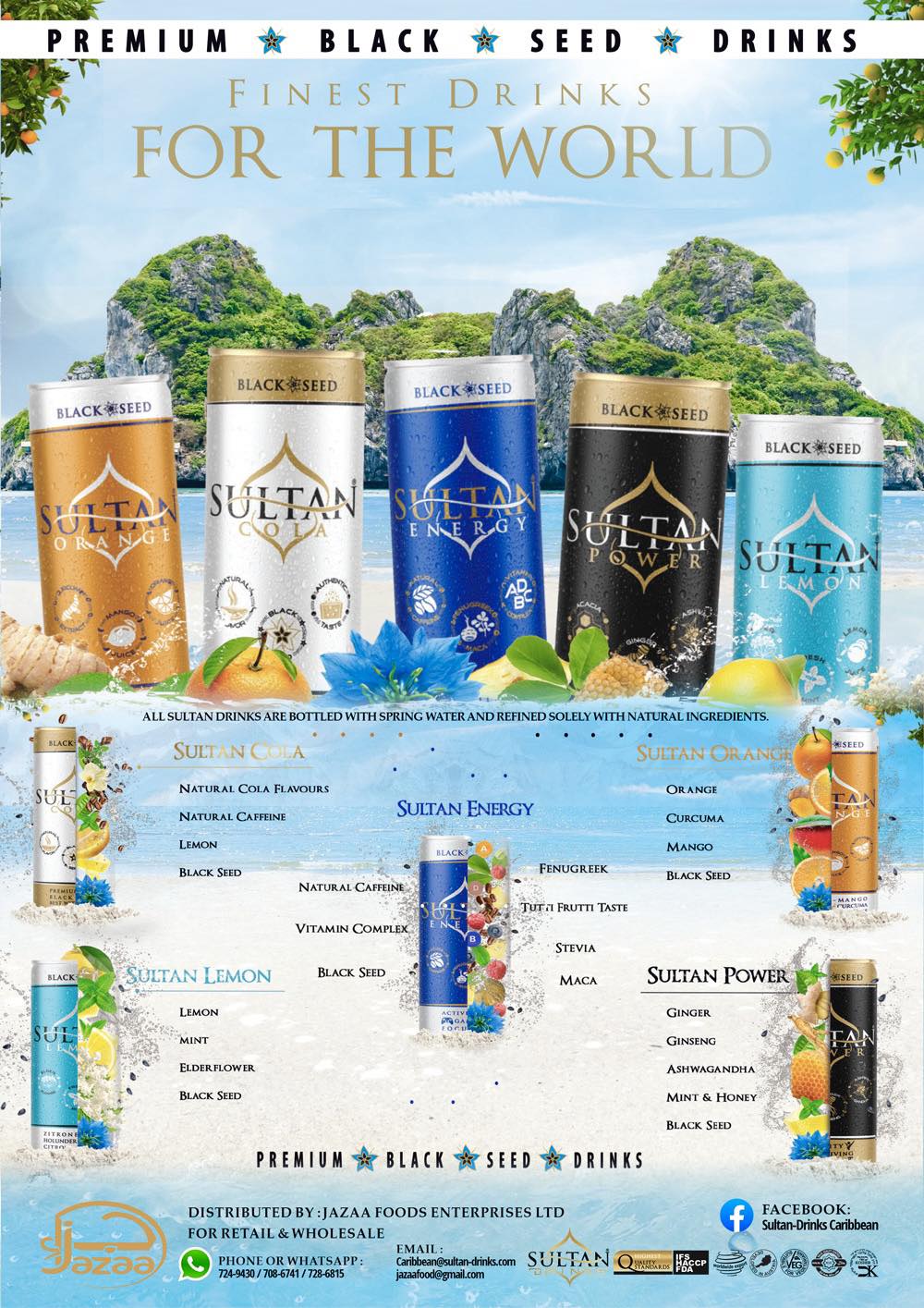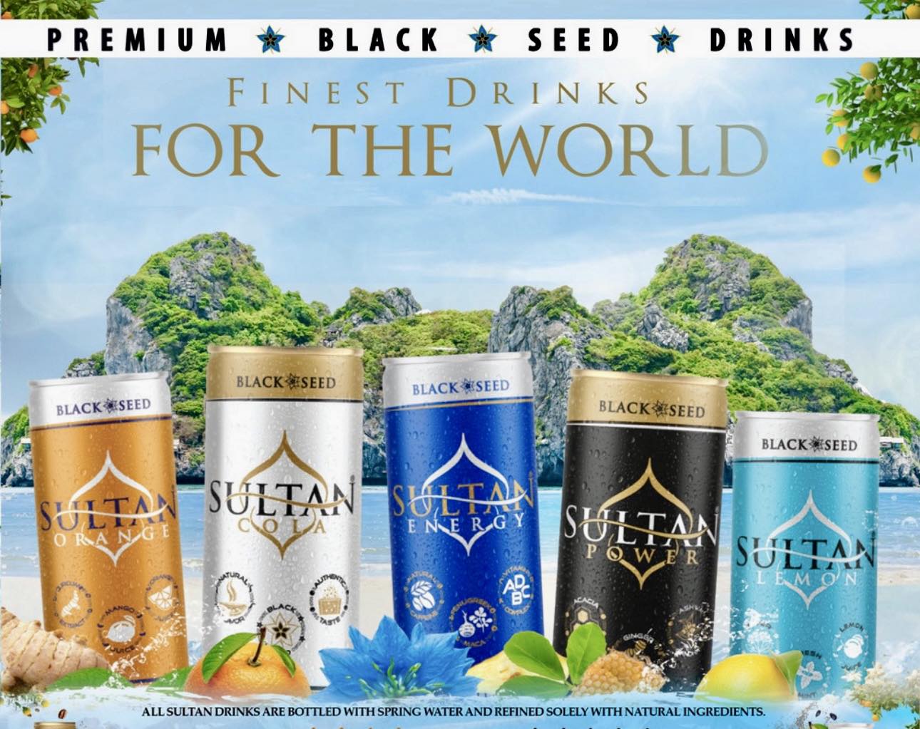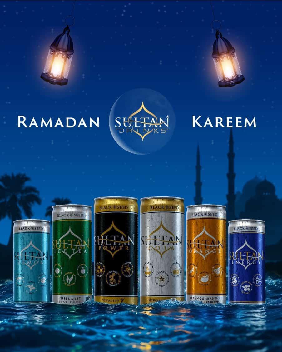 Sultan™ combines Nigella sativa (black seed) with ginger, ginseng, ashwagandha, mint, honey, green tea and fruit notes — delivering a functional drink that supports clarity, vitality and hydration.